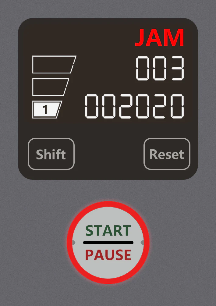 Kontrolka tlačítka START se rozsvítí červěně, pokud se zobrazí hlášení JAM